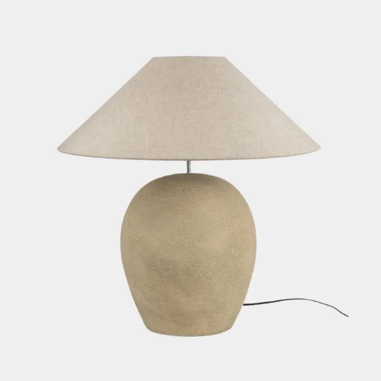 En flot afrundet lampe der er produceret af cement og sten. Lampen er elegant og rå på samme tid.