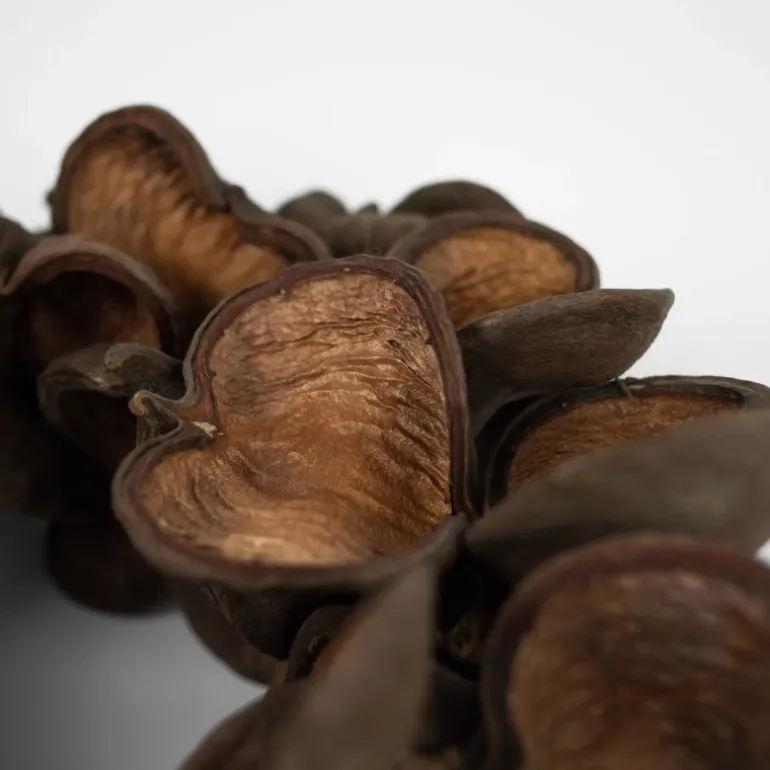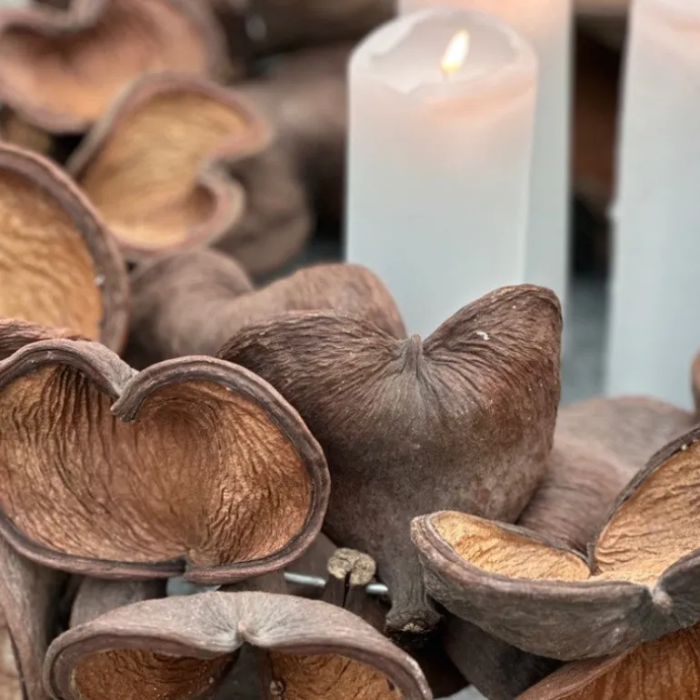 Meget dekorative krans i tørret mandelnød, – kransen kan både bruges inde og ude.