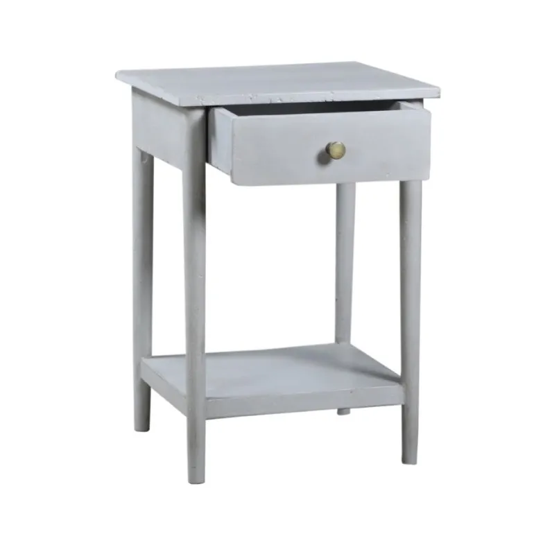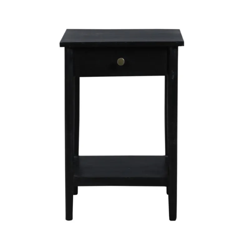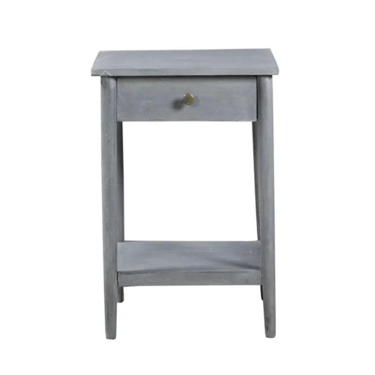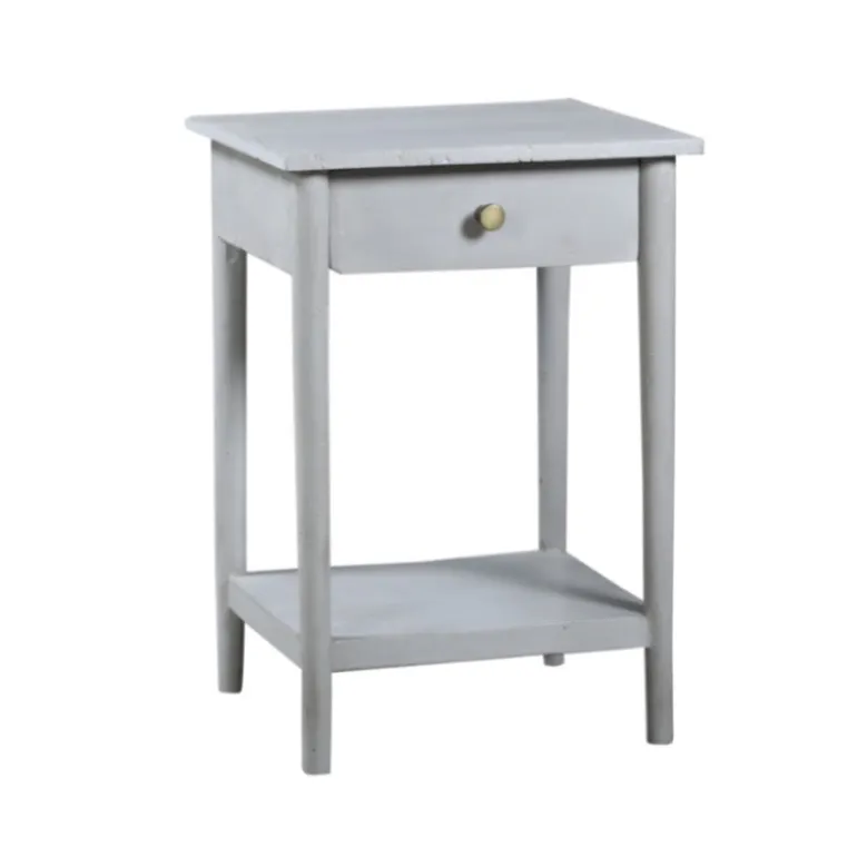 Fint natbord med koniske ben, skuffe og hylde nederst, er produceret i Nordindien i genbrugstræ, og fås i brun, sort, mørkegrå og lysegrå.