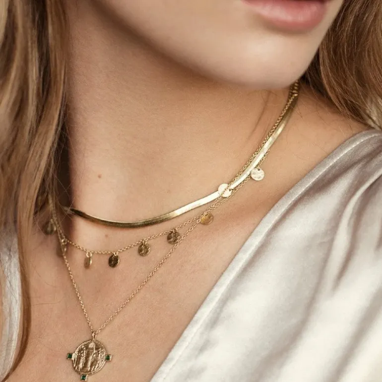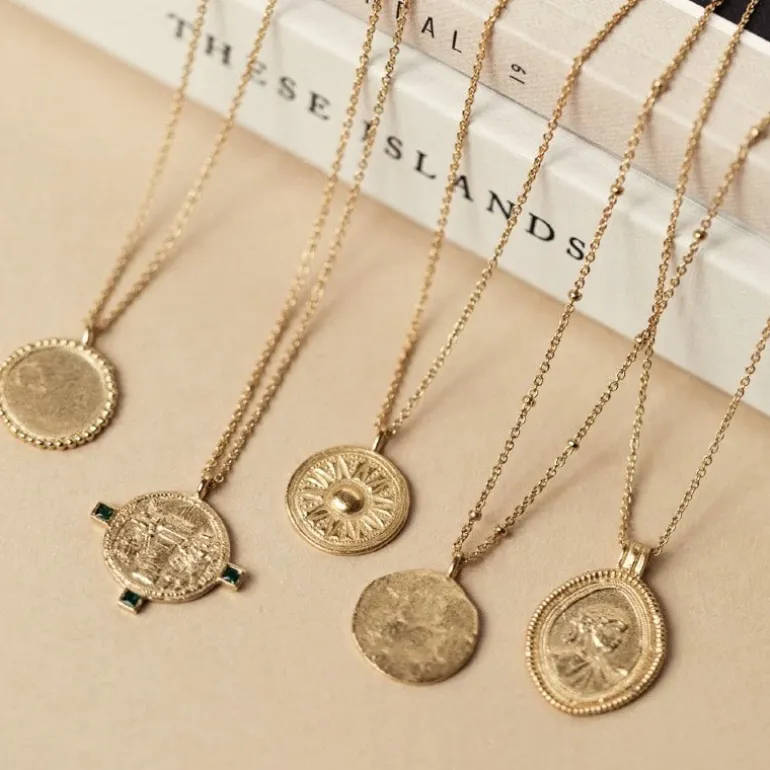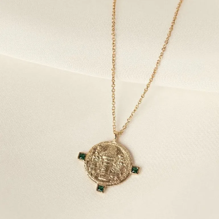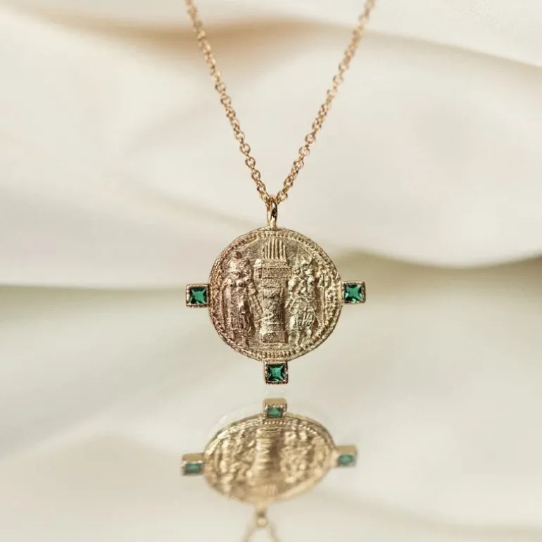 Rania halskæde, inspireret af Sasanske graveringer, repræsenterer denne falmede gamle mønt kongeparret i det berømte Sasaniske imperium. De var kendt for deres ambitioner og utrolige mod.