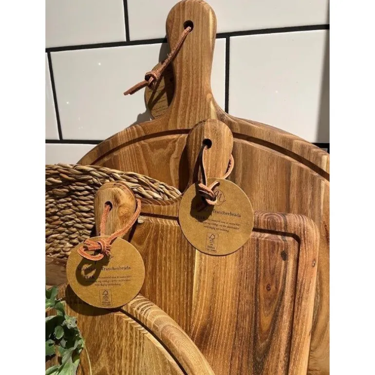Smukt skærebræt i teaktræ. For at bevare serveringsbrættets skønhed og levetid anbefales det at rengøre det med en fugtig klud og mildt rengøringsmiddel efter brug.