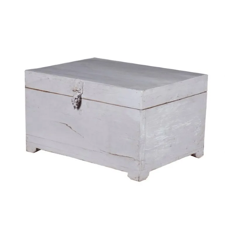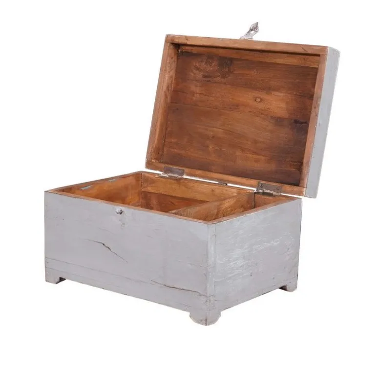 Skønt gammelt træskrin fra Indien med et stort og et lille rum til opbevaring. Skrinet er sat i stand og malet i en lys grå.