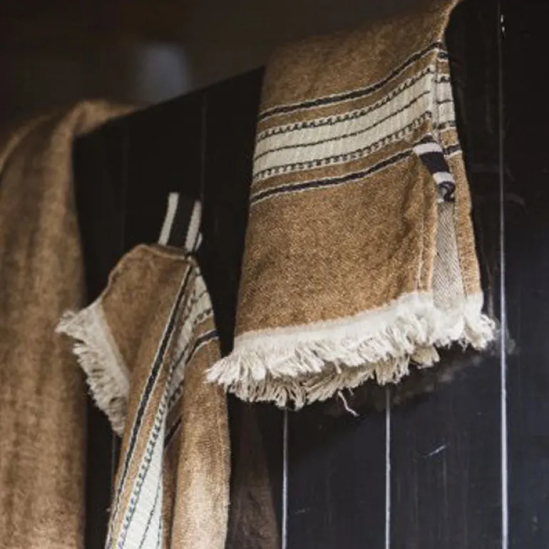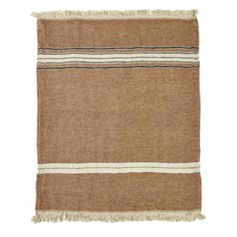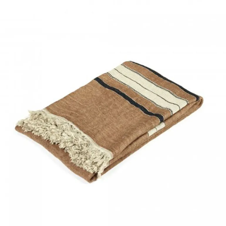 Dette belgiske hør throw har et helt specielt udtryk. Bundfarven i kobber er en satin vævning der giver et lidt skindende udtryk. De sorte og elfenbensfarvede striber samt frynserne i enderne, giver et mere afslappet udtryk, så tæppet fremstår ganske unikt.