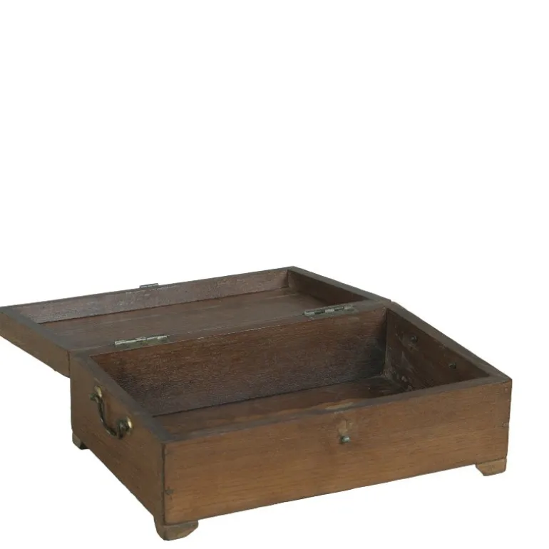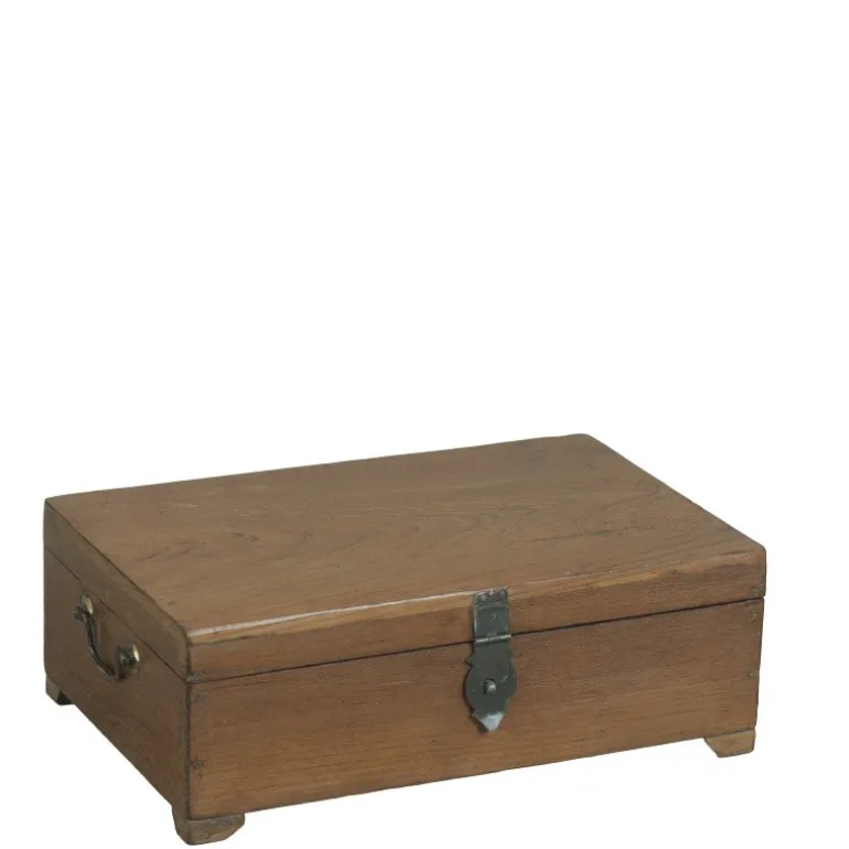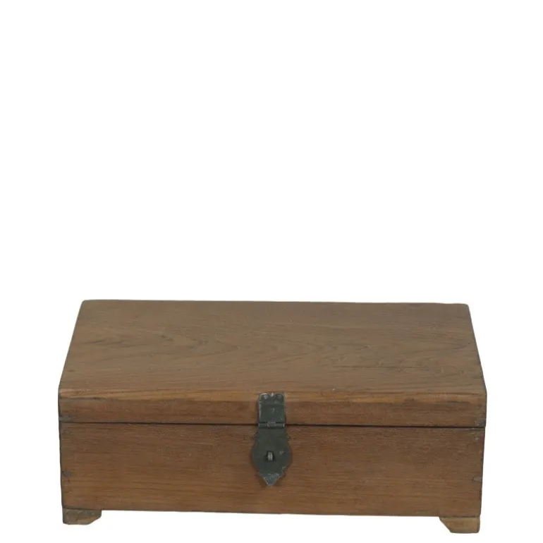 Gammelt unikt træskrin fra Indien, med en metallukkemekanisme og hængsler. Brug skrinet til opbevaring af smykker, sygrej eller andre små skatte.