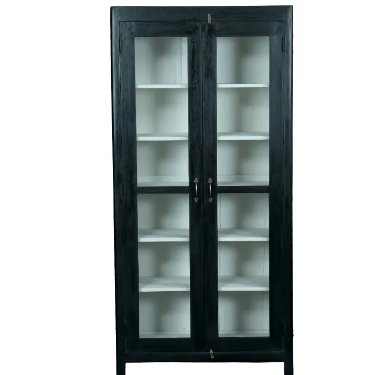 Dette fine vitrineskab med glaslåger er et gammelt unika skab, der er restaureret og malet sort udvendig og hvid indvendig, som gør skabet mere lyst og at de ting man opbevarer i skabet kommer mere til syne. Skabet har seks hylder, hvis man tælle bunden med og er som skabt til opbevaring af glas, porcelæn eller bøger og blade.