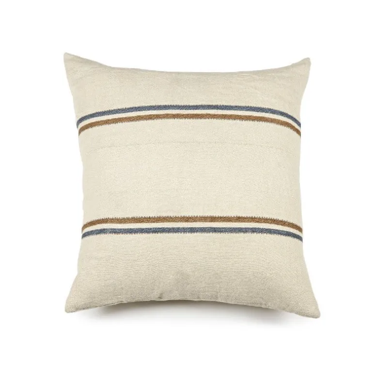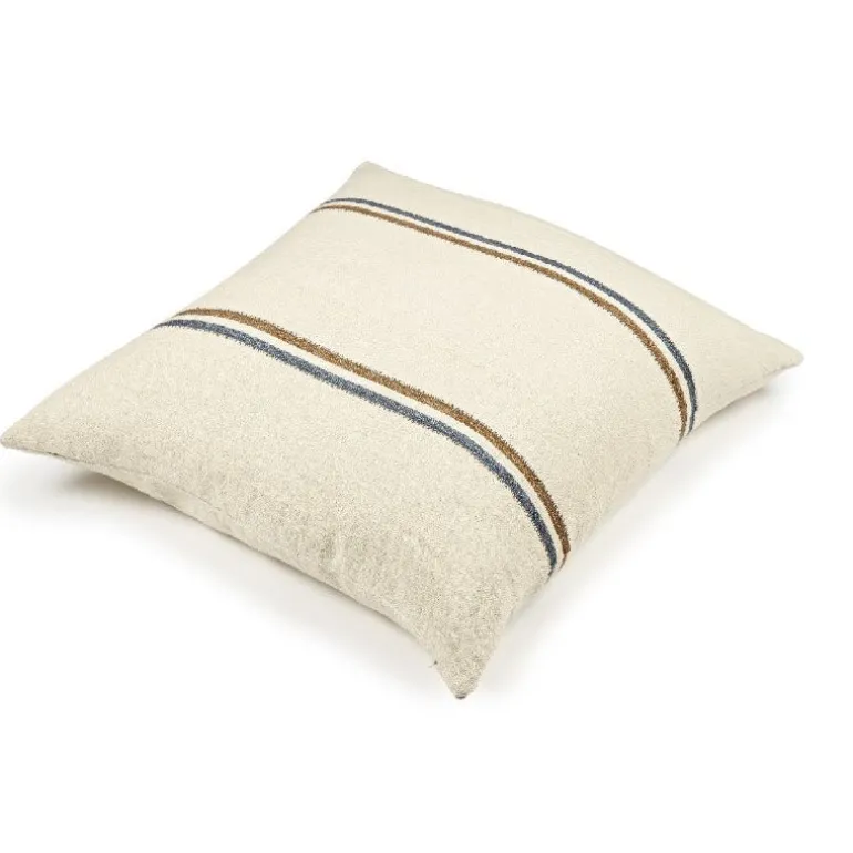 Fint pudebetræk 100% hør, med lys off-white bund og enkle striber i blå og brun.