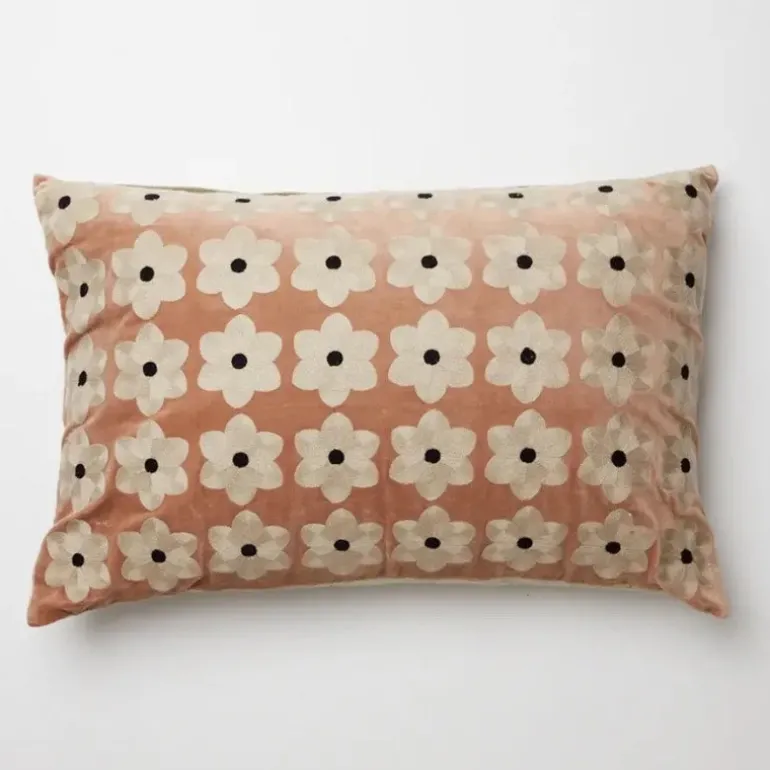 Fløjlspudebetræk med broderede blomster og hørbagside