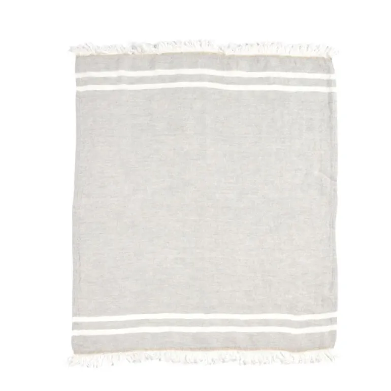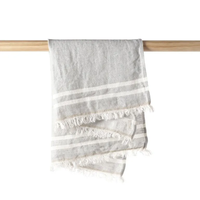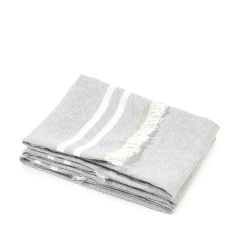 Lækker gæstehåndklæde i 100% hør og en skøn afdæmpet grå farve, med hvide striber og frynser i begge ender. Brug dem som små gæstehåndklæder på gæstetoilettet eller som et lille køkken håndklæde.