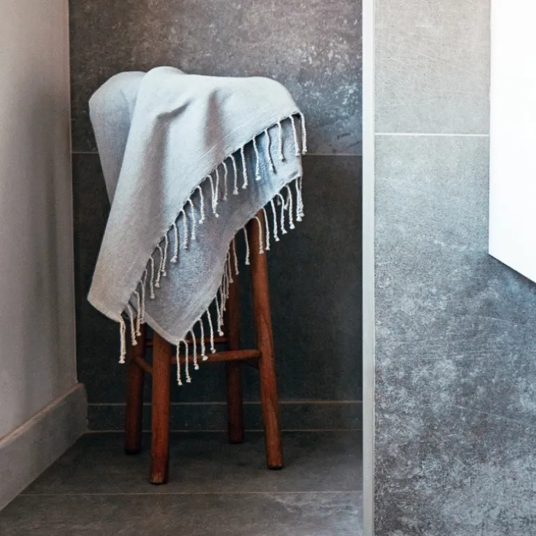 Hamam Eponge håndklædet, med frotté på bagsiden er REN luksus, vævet i 100% kemikaliefri genbrugs bomuld, med håndknyttede frynser.