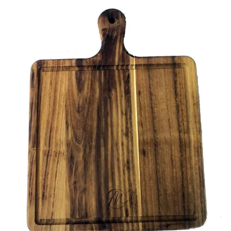 Smukt skærebræt i teaktræ. For at bevare serveringsbrættets skønhed og levetid anbefales det at rengøre det med en fugtig klud og mildt rengøringsmiddel efter brug.
