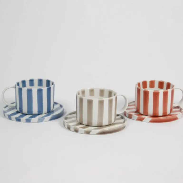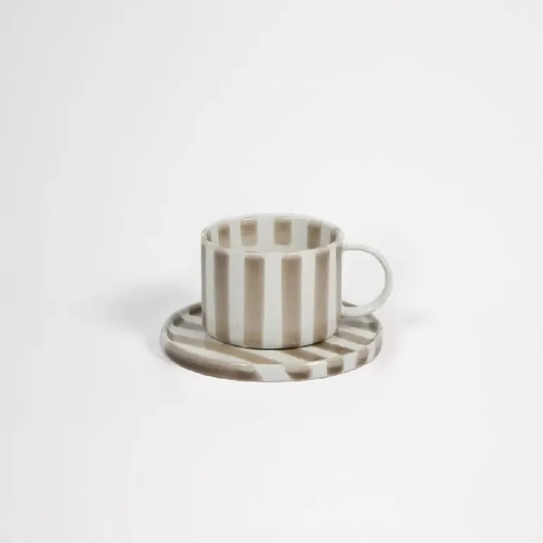 Sød kaffekop med tilhørende underkop i glade beige striber.