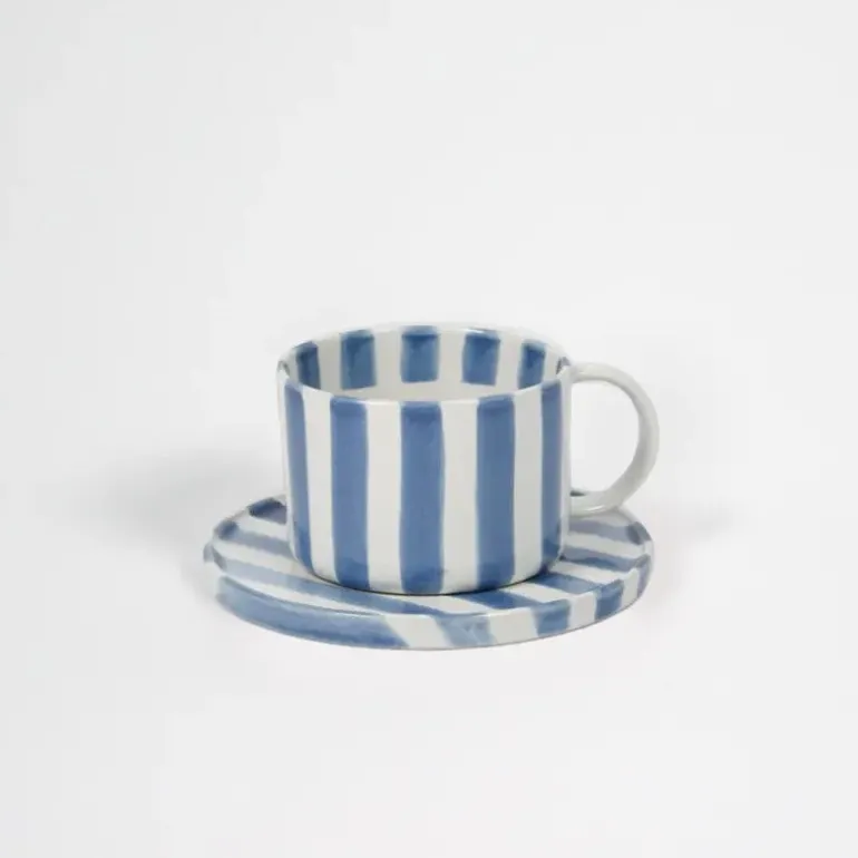Sød kaffekop med tilhørende underkop i glade blå striber.