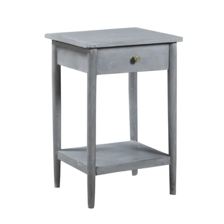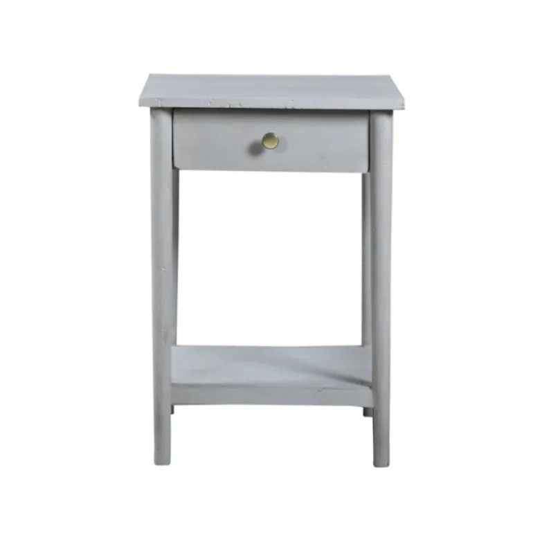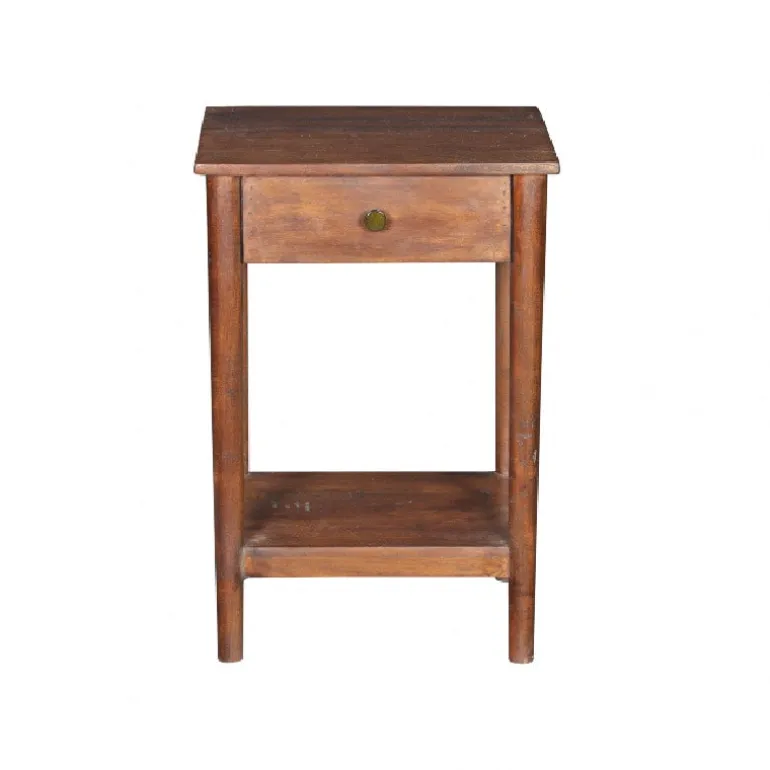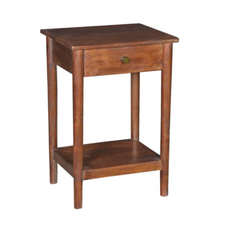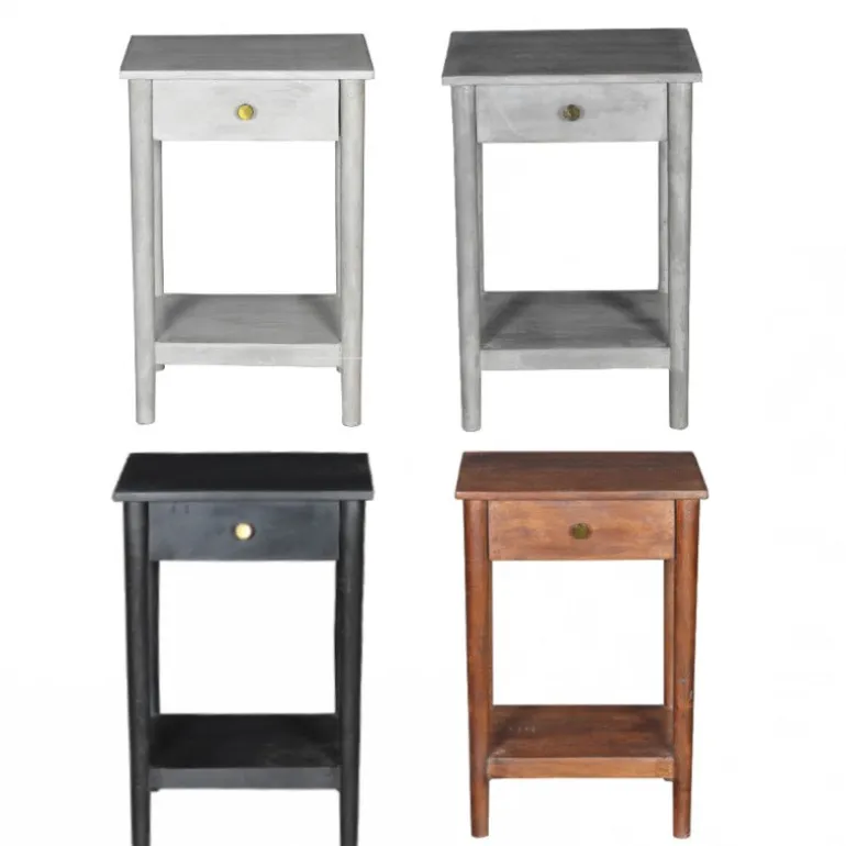 Fint natbord med koniske ben, skuffe og hylde nederst, er produceret i Nordindien i genbrugstræ, og fås i brun, sort, mørkegrå og lysegrå.