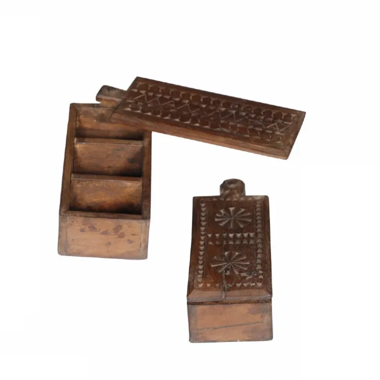 Skønne træskrin fra Indien, med smukke udskæringer i låget (der skydes til den ene side) og rum inddeling, hvor man her kan opbevare smykker eller andre små skatte.