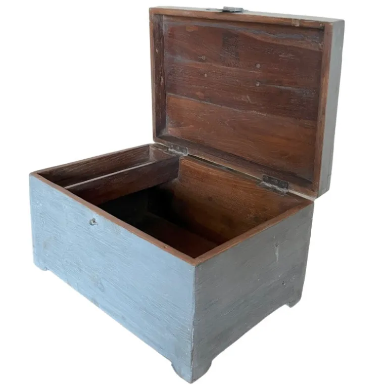Gammelt unikt træskrin fra Indien, med en metallukkemekanisme og hængsler. Brug skrinet til opbevaring af smykker, sygrej eller andre små skatte.