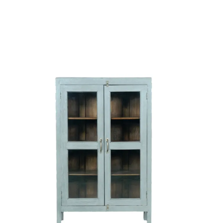 Dette fine vitrineskab med glaslåger er et gammelt unika skab, der er restaureret og malet lysegråt udvendigt og naturlig træ indvendig. Skabet har fire hylder, hvis man tælle bunden med.