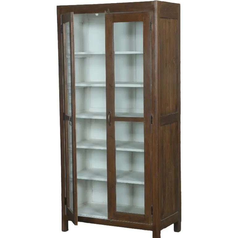 Dette fine vitrineskab med glaslåger er et gammelt unika skab, der er restaureret. Vi har bebeholdt det naturlige træ udvendig og malet det hvid indvendig. Skabet har seks hylder, hvis man tælle bunden med.