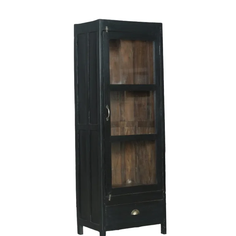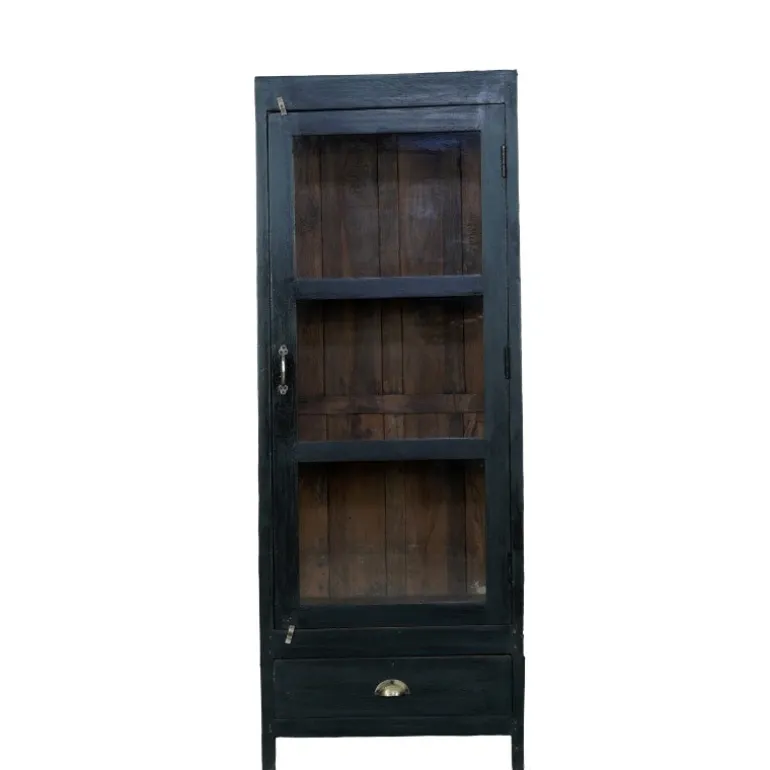 Dette slanke vitrineskab med glaslåger er et gammelt unika skab, der er restaureret. Skabet har tre hylder og en skuffe.