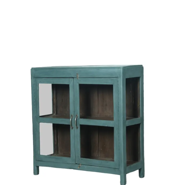 Et fint lille vitrineskab med glaslåger er et gammelt unika skab, der er restaureret Skabet har to hylder, hvis man tælle bunden med, det vil være rigtig fint på badeværelset.