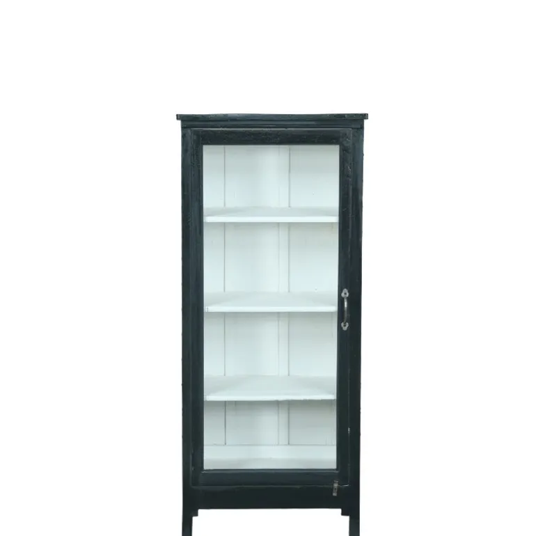 Dette fine lille vitrineskab med glaslåger er et gammelt unika skab, der er restaureret og malet sort udvendig og hvid indvendig, som gør skabet mere lyst og at de ting man opbevarer i skabet kommer mere til syne. Skabet har fire hylder, hvis man tælle bunden med.