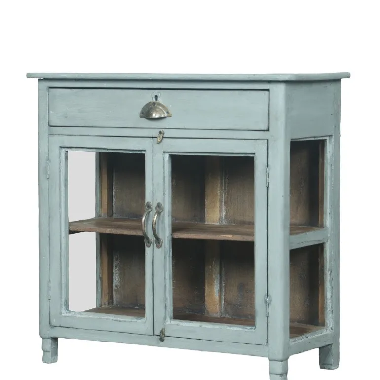 Dette vitrineskab er et gammelt unika skab, der er restaureret. Skabet har to hylder, hvis man tæller bunden med.